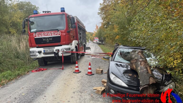 Ein PKW wurde von einem Baum durchschlagen, droht den Hang abzurutschen, ein weiterer PKW liegt auf dem Fahrzeugdach in einem 3m tiefen Graben. In beiden Fahrzeugen ist eine Person eingeklemmt. Das war die Lage für eine Einsatzübung am vergangenen Wochenende.