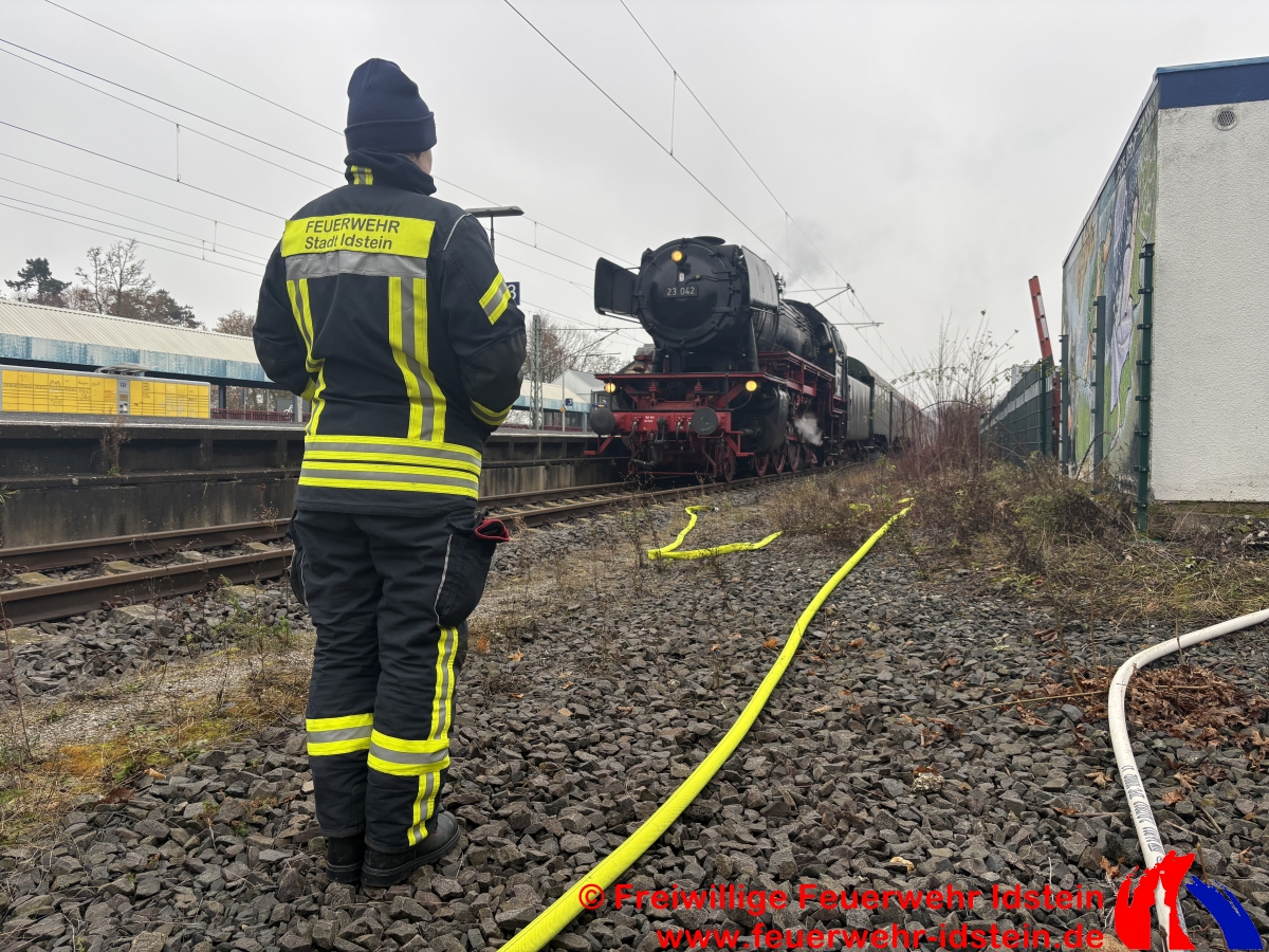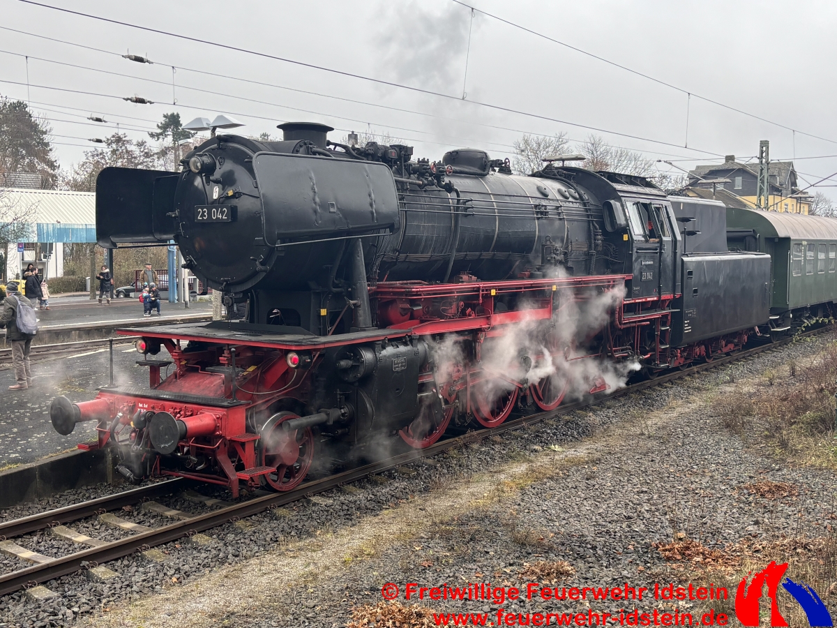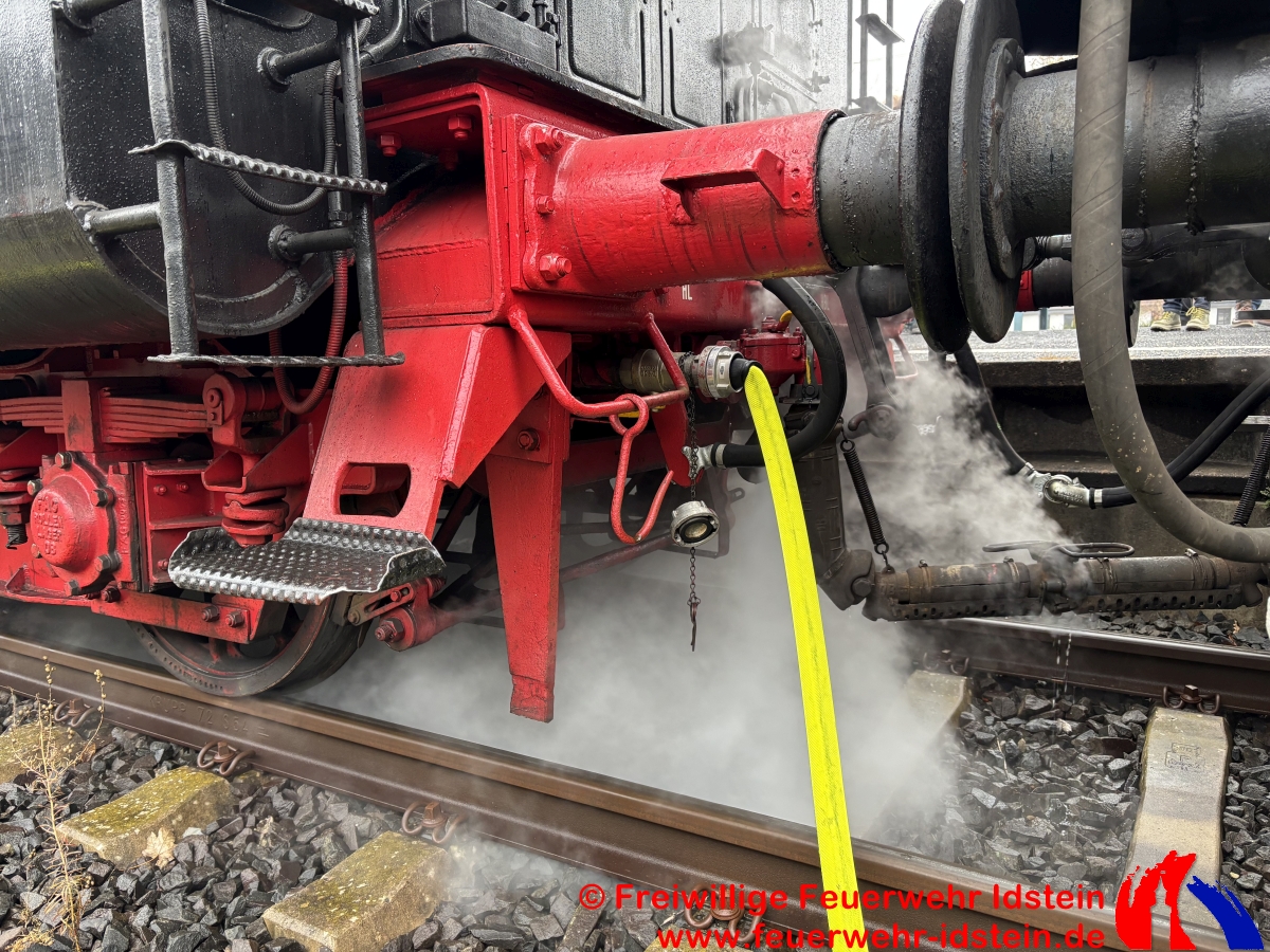 Auf Bitten des Veranstalters versorgten wir den Zug zweimal bei seinem Halt in Idstein mit der benötigten Menge Wasser. Wir nutzten dazu unser Tanklöschfahrzeug und den Abrollbehälter „Tank“ auf unserem Wechselladerfahrzeug. Die Tanks der beiden Fahrzeuge dienten dabei als Puffer, da die Durchflussmenge aus dem öffentlichen Netz aufgrund einer verpflichtend zwischengeschalteten städtischen Wasseruhr am Hydranten sonst nicht ausgereicht hätte, die Lok in der knapp einstündigen Standzeit rechtzeitig und ausreichend zu versorgen. Über mehrere Schläuche wurde das Wasser von der Straße „Am Güterbahnhof“, am Kulturbahnhof vorbei, ans Gleis 3 des Idsteiner Bahnhofs gefördert. Während der Wartezeit wurden auch wir vom im Zug mitfahrenden Nikolaus mit kleinen Präsenten versorgt. Hierfür möchten wir uns recht herzlich bedanken.