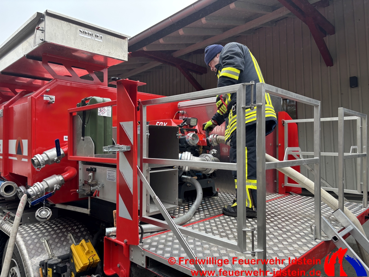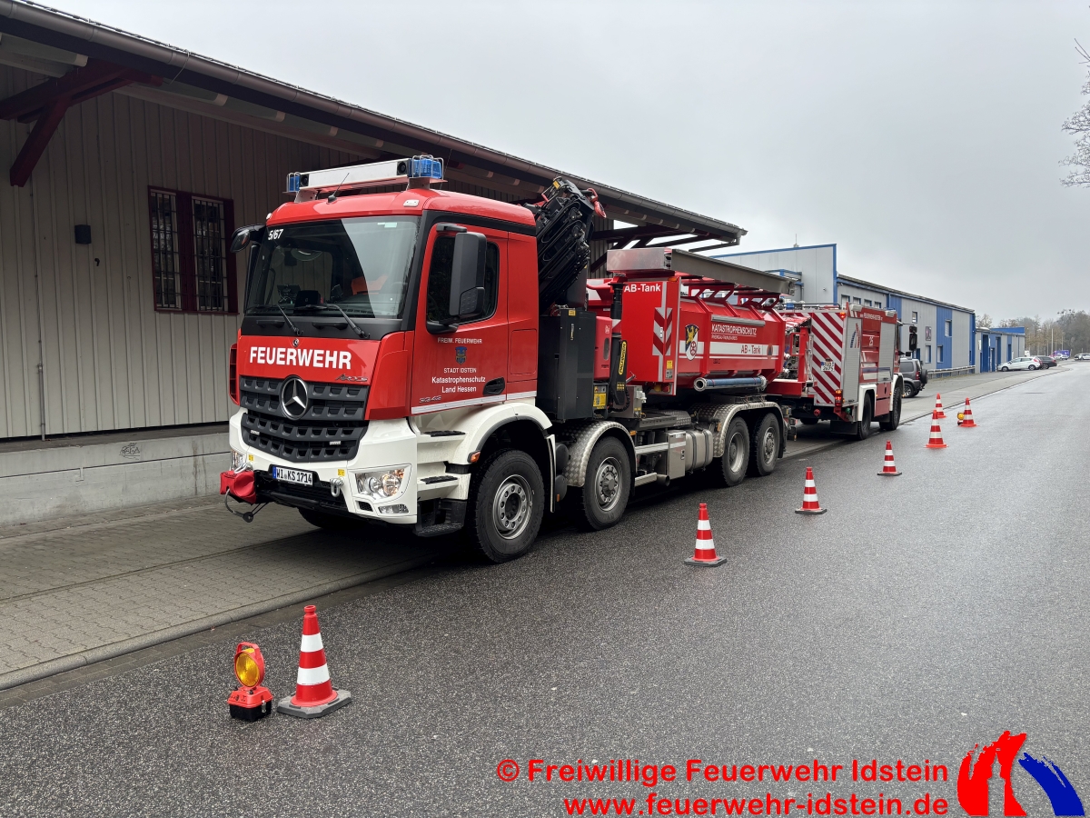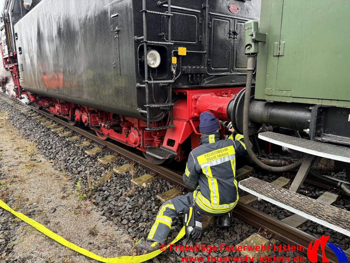 Auf Bitten des Veranstalters versorgten wir den Zug zweimal bei seinem Halt in Idstein mit der benötigten Menge Wasser. Wir nutzten dazu unser Tanklöschfahrzeug und den Abrollbehälter „Tank“ auf unserem Wechselladerfahrzeug. Die Tanks der beiden Fahrzeuge dienten dabei als Puffer, da die Durchflussmenge aus dem öffentlichen Netz aufgrund einer verpflichtend zwischengeschalteten städtischen Wasseruhr am Hydranten sonst nicht ausgereicht hätte, die Lok in der knapp einstündigen Standzeit rechtzeitig und ausreichend zu versorgen. Über mehrere Schläuche wurde das Wasser von der Straße „Am Güterbahnhof“, am Kulturbahnhof vorbei, ans Gleis 3 des Idsteiner Bahnhofs gefördert. Während der Wartezeit wurden auch wir vom im Zug mitfahrenden Nikolaus mit kleinen Präsenten versorgt. Hierfür möchten wir uns recht herzlich bedanken.