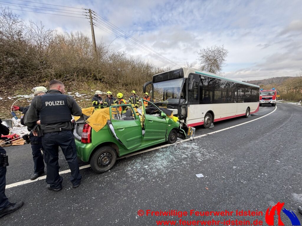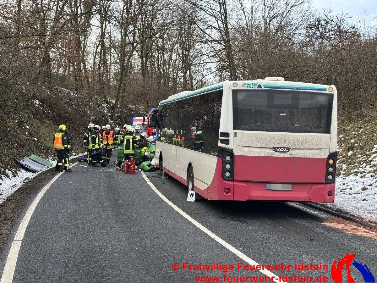 Auf der B275 war es am Ortsausgang von Idstein-Eschenhahn zu einem Frontalzusammenstoß zwischen einem Bus und einem PKW gekommen. Wir wurden mit unserem Rüstwagen und dem Einsatzleitwagen zur Unterstützung der initial alarmierten Feuerwehren alarmiert. Eine Person musste mit Hilfe von hydraulischem Rettungsgerät aus ihrem Fahrzeug befreit werden. Nachdem dies geschehen war und die Person dem Rettungsdienst übergeben worden war, konnten wir unseren Unterstützungseinsatz beenden.